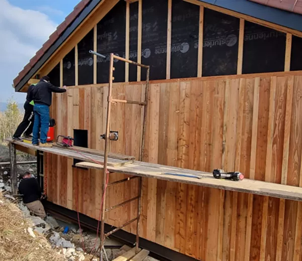 Mise en œuvre d’un bardage bois vertical sur une construction en ossature bois, assurant à la fois protection de la façade et intégration naturelle dans l’environnement montagnard. Cette réalisation illustre le soin apporté aux finitions et à la durabilité des matériaux pour valoriser l’esthétique du bâtiment.