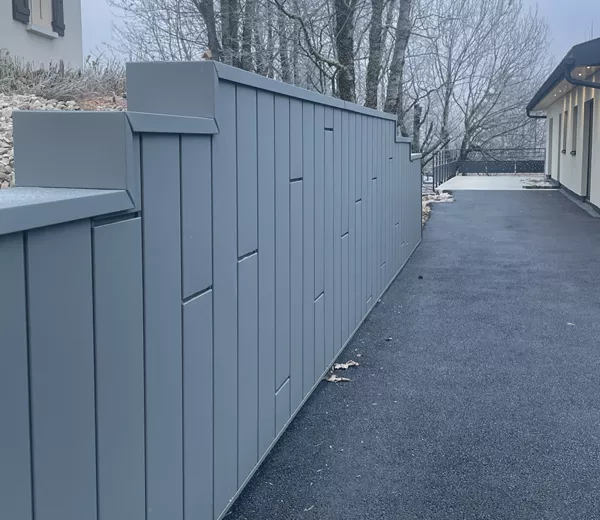Réalisation d’un habillage en bardage métallique pour protéger et moderniser un muret extérieur. Les lignes verticales apportent une finition contemporaine tout en assurant une bonne résistance aux intempéries et une intégration esthétique avec l’environnement existant.