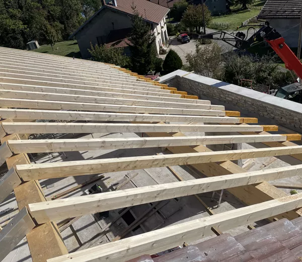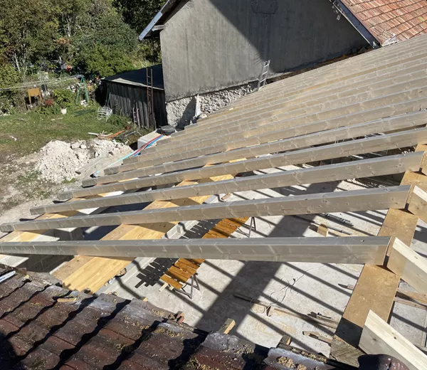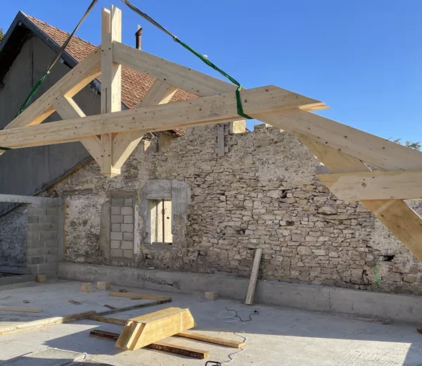 Mise en place d’une charpente bois sur une rénovation de bâtiment ancien, avec levage et assemblage des fermes sur site. Cette structure sur mesure assure la solidité de l’ouvrage tout en respectant l’architecture existante et les contraintes techniques du projet.