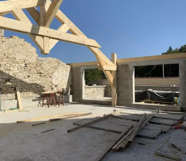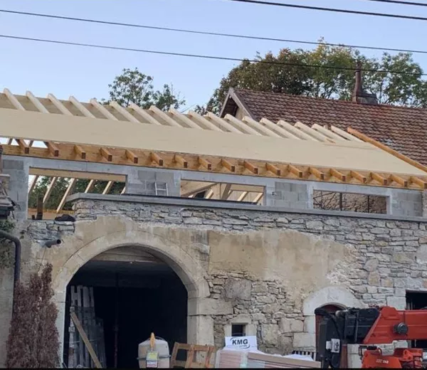 Mise en œuvre d’une charpente bois avec assemblages précis et structure robuste, conçue pour assurer solidité et durabilité de l’ouvrage. Une réalisation illustrant l’expertise de MG Constructions en construction et rénovation de charpentes.