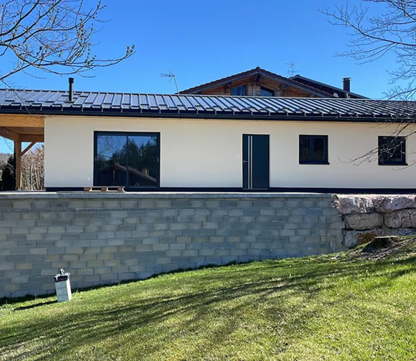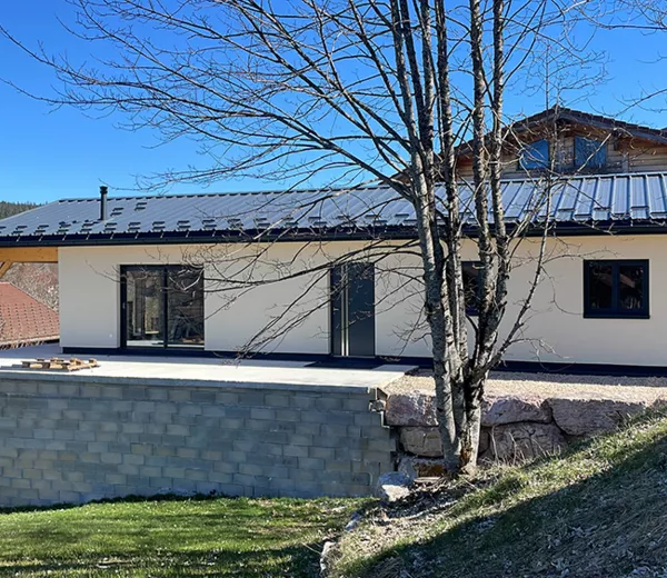 Réalisation d’une couverture en bac acier sur extension, avec finitions soignées en zinguerie et intégration des évacuations d’eaux pluviales. Une solution durable et esthétique, adaptée aux lignes modernes de l’habitation et aux contraintes climatiques du Haut-Jura.