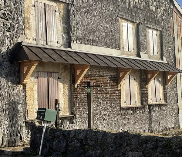 Création d’un auvent en zinguerie avec couverture métallique à joint debout, conçu pour protéger durablement les ouvertures tout en s’intégrant au caractère traditionnel du bâtiment. Cette réalisation associe structure bois et habillage métallique pour allier esthétique, étanchéité et longévité.