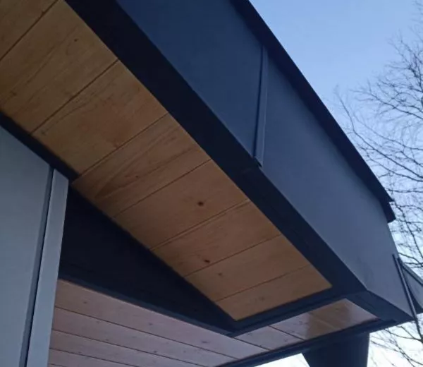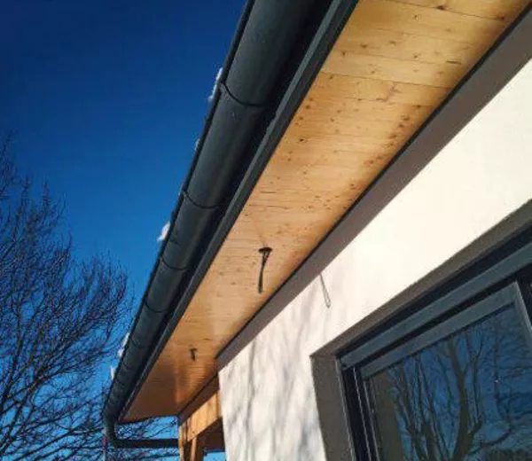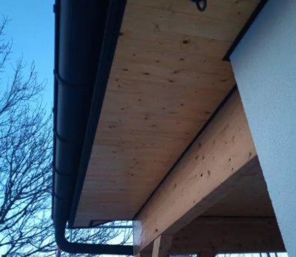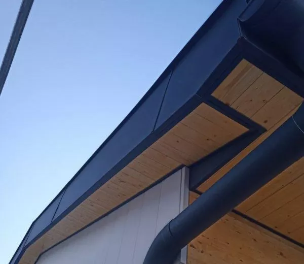 Travaux de zinguerie avec pose d’un habillage de rive et installation d’une descente d’eau pluviale assurant une évacuation efficace et une finition esthétique soignée. Une réalisation alliant protection durable et intégration harmonieuse à la structure bois.